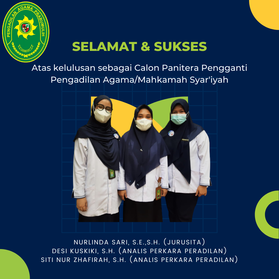 https://pa-prabumulih.go.id/ Prabumulih - Selasa (26/04/2022), berdasarkan pengumuman dari Ditjen Badilag MA RI nomor 2520/DjA/KP.04.6/4/2022 perihal Hasil Seleksi Calon Panitera Pengganti (CPP) Pengadilan Agama/Mahkamah Syar'iyah secara daring tahun 2022, Alhamdulillah semua peserta seleksi CPP dari Pengadilan Agama Prabumulih atas nama (Nurlinda Sari, S.E.,S.H, Desi Kuskiki, S.H, dan Siti Nur Zhafirah, S.H.) dinyatakan lulus.