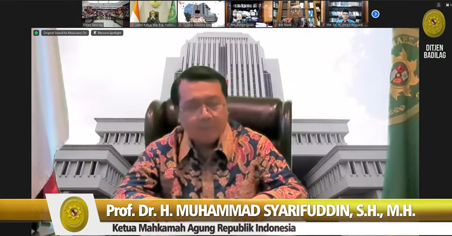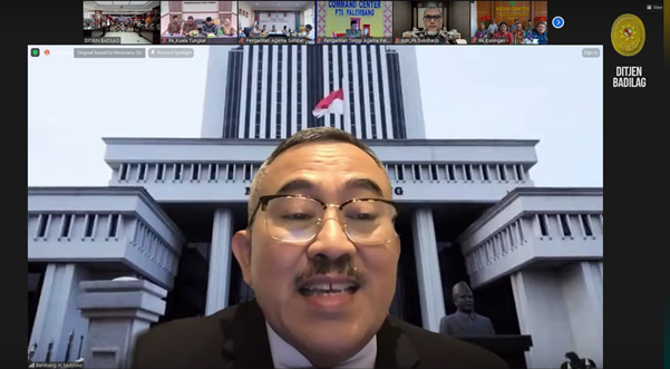 Plt. Direktur Jenderal Badan Peradilan Agama, Bambang Hery Mulyono, S.H., M.H. membuka kegiatan Sosialisasi Hasil Pendidikan dan Pelatihan Ekonomi Syariah pada Higher Judicial Institute Universitas Islam Imam Muhammad Bin Saud, Riyadh, Arab Saudi di Lingkungan Peradilan Agama secara daring, Jumat (15/12). Kegiatan ini dihadiri oleh Sesditjen Badilag, Drs. Arief Hidayat, S.H., M.M., Pejabat Eselon III Ditbinganis dan seluruh tenaga teknis di lingkungan peradilan agama.