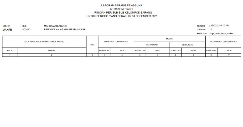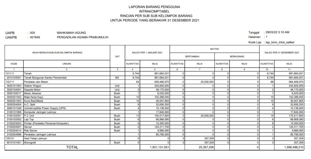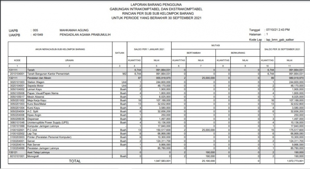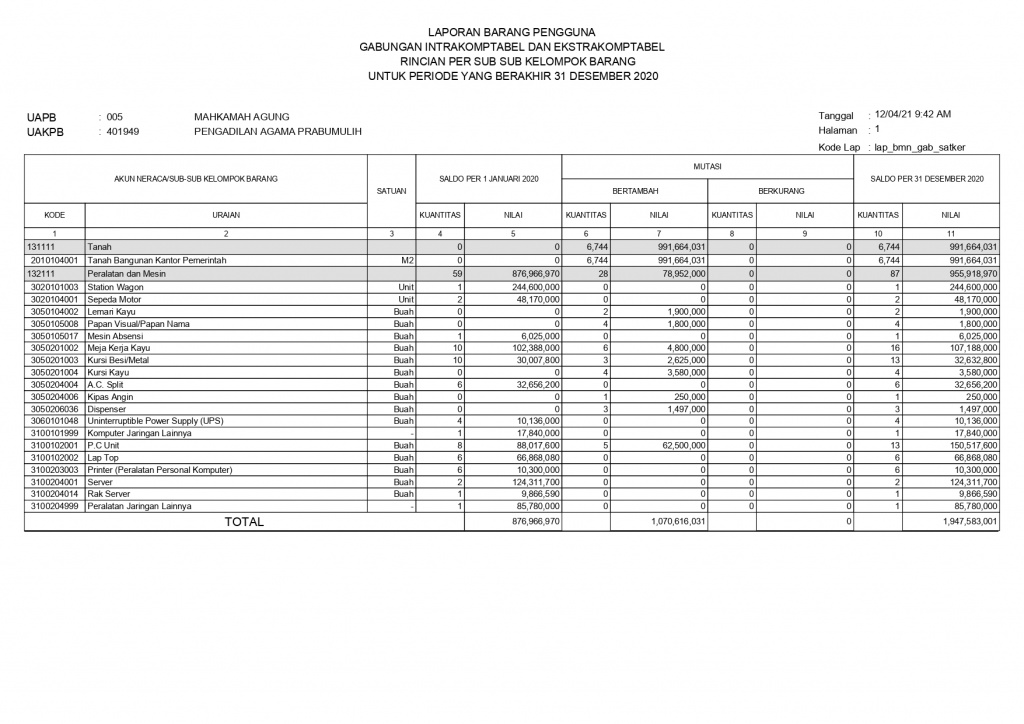 Ringkasan Aset dan Inventaris Pengadilan Agama Prabumulih, adalah sebagai berikut :